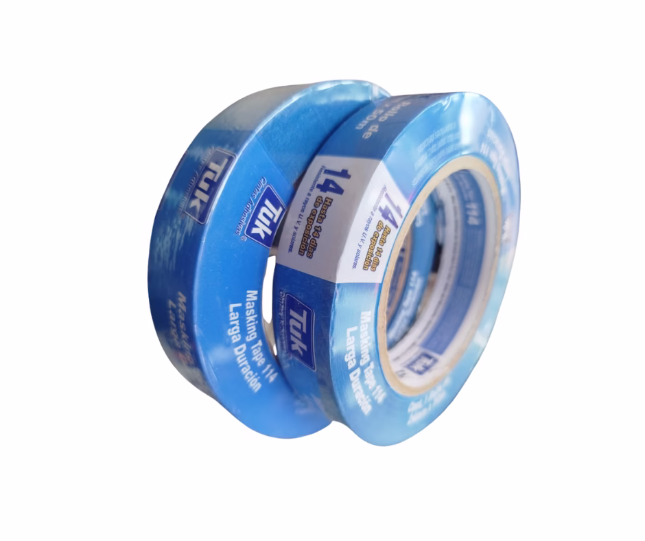 La cinta masking azul de la marca TUK, específicamente el modelo 114, es una cinta de enmascarar de papel crepe, diseñada para trabajos de pintura que requieren larga duración y remoción limpia.
